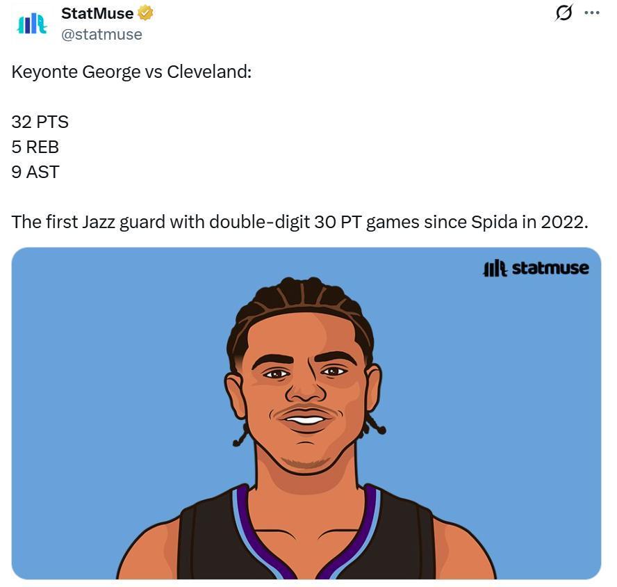 凭借这样的表现,乔治本赛季已经10次砍下30+得分表现,成为爵士队史米切尔之后,首位单赛季至少10次拿下30+得分的后卫。