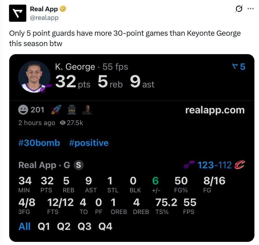 同时本赛季也只有5名控卫球员单场30+场次比基扬特-乔治更多,这意味着,乔治不仅正在飞速成长为爵士队新的后场核心,也在成为NBA新生代后场球员中的佼佼者。